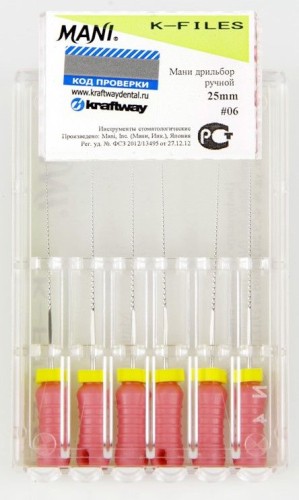 Рабочая часть К-файла № 06 Mani со спиралевидной нарезкой снимает тонкие слои дентина, не повреждая окружающие ткани, а длина инструмента в 25 мм позволяет обрабатывать все типы каналов. Точность и безопасность в работе достигются за счет применения силиконовых стопперов.